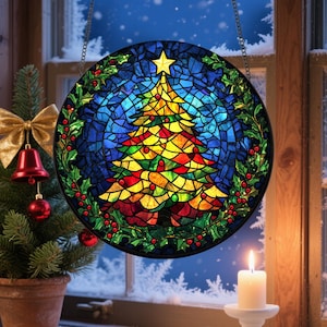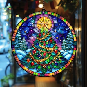 Christmas tree Stained Glass Suncatcher, Snow Christmas Decor, Christmas tree Acrylic Suncatcher, Gift For Family Window Hanging, Gift Decor