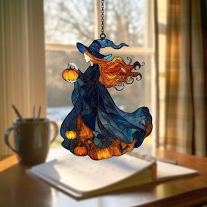 Halloween Witch Acrylic Suncatcher, Witch Faux Stained Glass, Pumpkin Witch Window Decor, Spooky Fall Ornament, Seasonal Home Decor